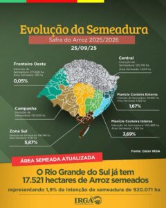 O Instituto Rio Grandense do Arroz (Irga), por meio dos Núcleos de Assistência Técnica e Extensão Rural (Nates), divulgou no fim da última semana o primeiro balanço do avanço da semeadura da safra 2025/2026 no Rio Grande do Sul. Até o momento, foram implantados 17.521 hectares, o que corresponde a 1,9% da intenção total de semeadura, estimada em 920.071 hectares para o ciclo.