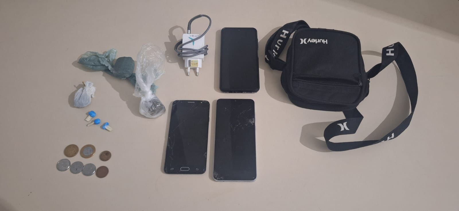 Com os indivíduos, foram apreendidas três buchas de cocaína, duas porções grandes e uma pequena de maconha.