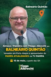 O vereador de Porto Alegre e comunicador da TV Pampa Tiago Albrecht irá visitar Palmares do Sul no próximo dia 16 de maio para um almoço de confraternização e diálogo com a comunidade local. O evento começa a partir das 12h, no Quintão.
